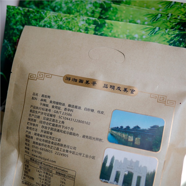 酱板鸭:明友芷江鸭,酱香浓郁,地道湘味 产品介绍 芷江酱板鸭精选本地放养的麻鸭,采用传统工艺制作,香、辣、脆、爽,深受广大消费者喜爱。侗佬坛私厨现杀现炒的芷江鸭请提前订制。 上一篇:山茶油芷江鸭:明友山茶油炒鸭真空装舌尖美食.. 下一篇:芷江炒鸭:香辣、微辣任选,开袋即食,美味就..